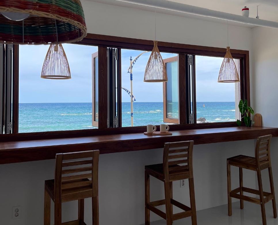 사진으로 봤을 때는 카페나 식당 느낌이었는데 2층은 비치 바 룸이다. 향긋한 커피와 와인을 즐기는 콘셉트의 방이라 커피 머신과 와인 냉장고가 있다고 한다. 바다향과 커피 향을 품은 이 룸은 바 너머로 보이는 바다가 인상적인 이곳은 집으로 가져오고 싶은 인테리어와 뷰이다.
